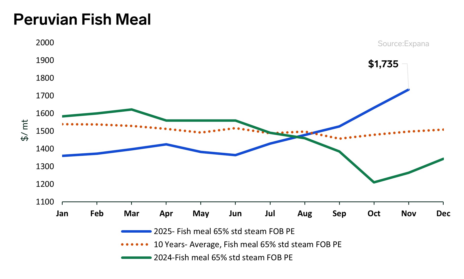The price of fishmeal has been on an upward trend in Peru since June 2025 (Figure 1). In October, a more active market was observed, with an increase of 6.9% month-on-month (m-o-m) and 35.0% year-on-year (y-o-y). This price movement may be related to the announcement that the provisional quota for the Second anchovy fishing season of 2025 in north-central Peru by the Ministry of Production (PRODUCE) was only 500,000 metric tons (mt)...
