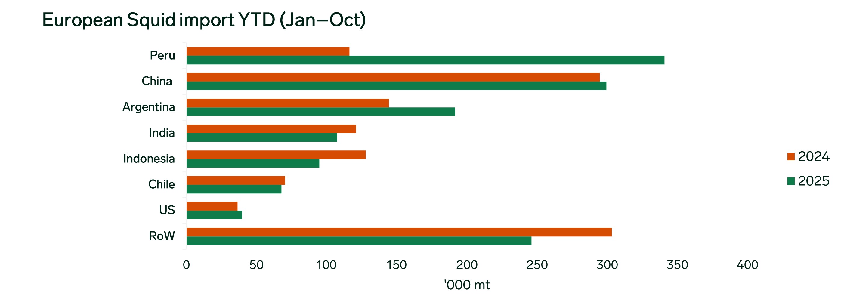 Frozen squid imports into the European (EU+UK) market increased by 14.25% year-to-date (YTD) for January–October. This growth was led by Peru, with imports up 193.1% YTD, followed by Argentina at 32.62% YTD. China showed modest growth of 1.6% YTD...