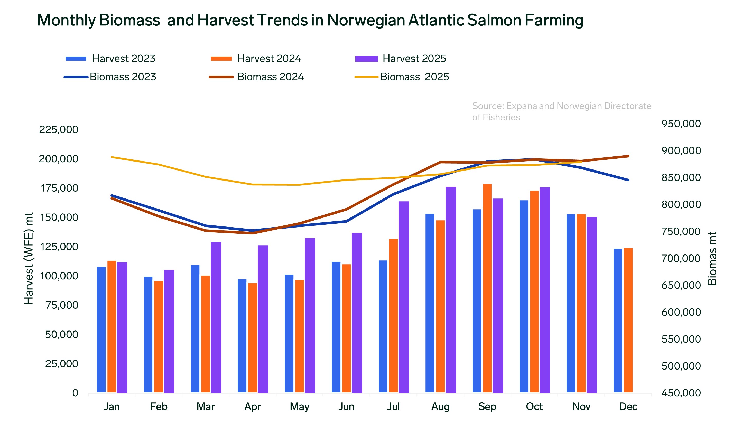 The total biomass of farmed Atlantic salmon at sea is trending slightly lower than in November 2024, declining by 0.2% (Figure 1), according to the Norwegian Directorate of Fisheries. However, the live biomass increased by 0.7% month-on-month (m-o-m). The accumulated harvest until November grew by 12.3% year-to-date (YTD), despite a slowdown in salmon removals since October. In November, the harvest dropped by 14.5% m-o-m and by 2.1% year-on-year (y-o-y) (Figure 1)...