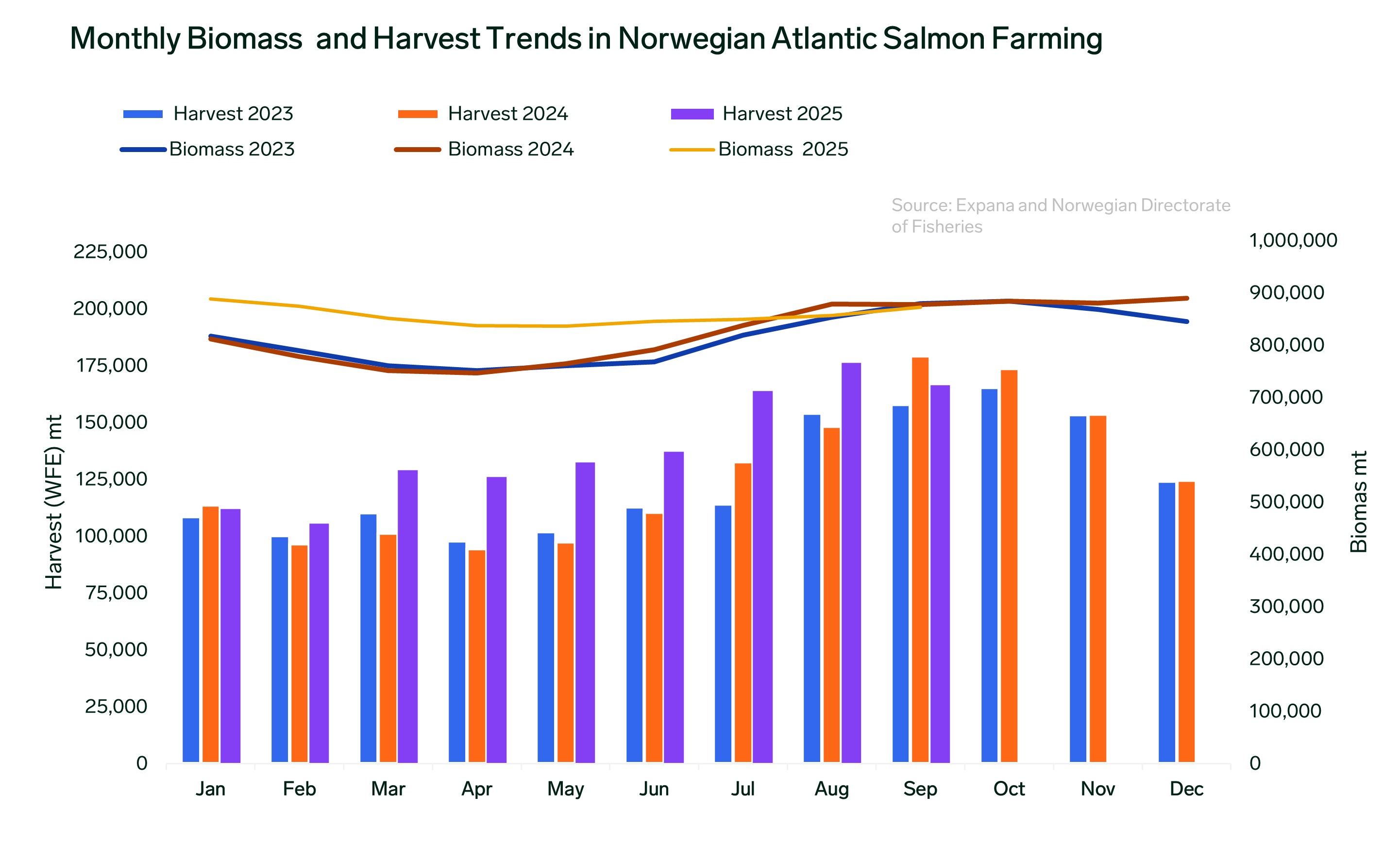 The total biomass of farmed Atlantic salmon at sea in Norway has been lower than in 2024 for two consecutive months, August and September. According to the Norwegian Directorate of Fisheries, the final biomass in September 2025 showed a modest year-on-year reduction of 0.6%. This decline in live fish stock may be linked to a marked increase in harvest volumes from June through August 2025. As a result, harvest intensity during those months rose by roughly 13.5%...
