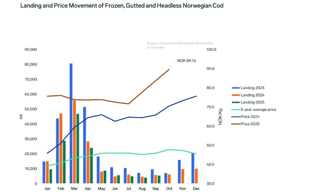 Historically, the price peak has occurred in October, and this year is no exception. Currently, Norwegian cod is valued at NOK 89.74 per kilogram ($8.97/kg, €7.70/kg) (Figure 1). The October level reflects a year-on-year (YOY) price increase of 27.2% and a...