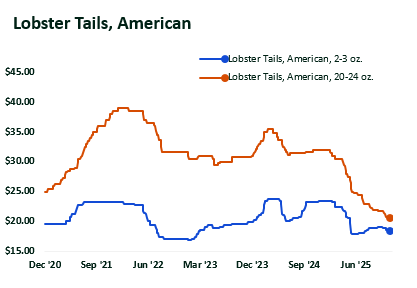 Over the past year, the North American lobster tail market has experienced a significant shift, driven by pronounced buyer preference for smaller tails and mounting pressure to manage unit costs. That shift is clearly captured in the narrowing price spread between the smallest and largest sizes. Historically, the delta between the smallest 2–3 oz and large 20–24 oz tails has averaged $7.335/lb and stretched as wide as $17.125/lb...